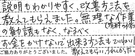説明もわかりやすく、改善方法を教えてもらえました。無理な作業(有料の修理)の勧誘もなく、なるべくお金をかけないで出来る方法もていねいに教えてもらい、うれしかった。