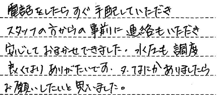 電話をしたらすぐ手配していただきスタッフの方からの事前に連絡もいただき安心しておまかせできました。水圧も調度よくなりありがたいです。又、なにかありましたらお願いしたいと思いました。