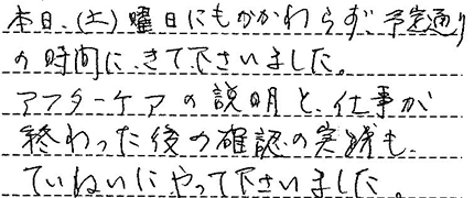 本日、(土)曜日にもかかわらず、予定通りの時間に、きて下さいました。アフターケアの説明と、仕事が終わった後の確認の実務もていねいにやって下さいました。