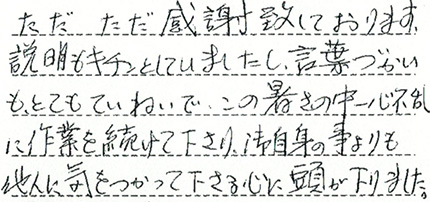 ただ ただ感謝致しております。説明もキチンとしていました、言葉づかいもとてもていねいで、この暑さの中一心不乱に作業を続けて下さり、自分自身の事よりも他人に気をつかって下さる心に頭が下がりました。