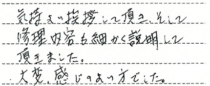 気持よい挨拶して頂き、そして修理内容も細かく説明して頂きました。