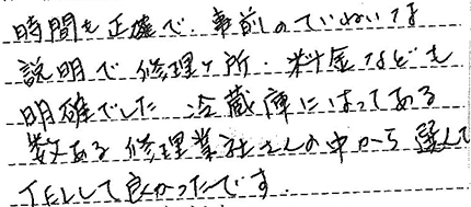 時間も正確で、事前の丁寧な説明で修理ヶ所・料金なども明確でした 冷蔵庫にはってある数ある数ある修理業者さんの中から選んでTELして良かったです