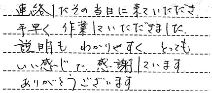 連絡したその当日に来ていただき手早く作業していただきました。説明も分かりやすくとってもいい感じで、感謝しています