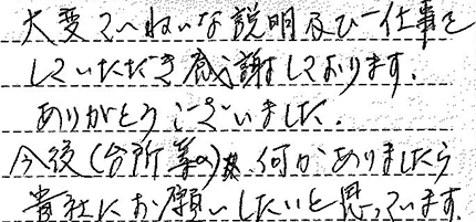 大変丁寧な説明及び仕事をしていただき感謝しております。ありがとうございました。今後(台所等の)何かありましたら貴社にお願いしたいと思っています。